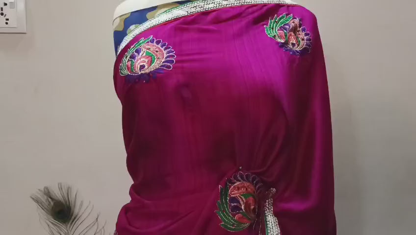 "7-Yard Silk Saree with Dual Tone Design – Magenta Embroidered Pallu & Blue-Gold Printed Base"