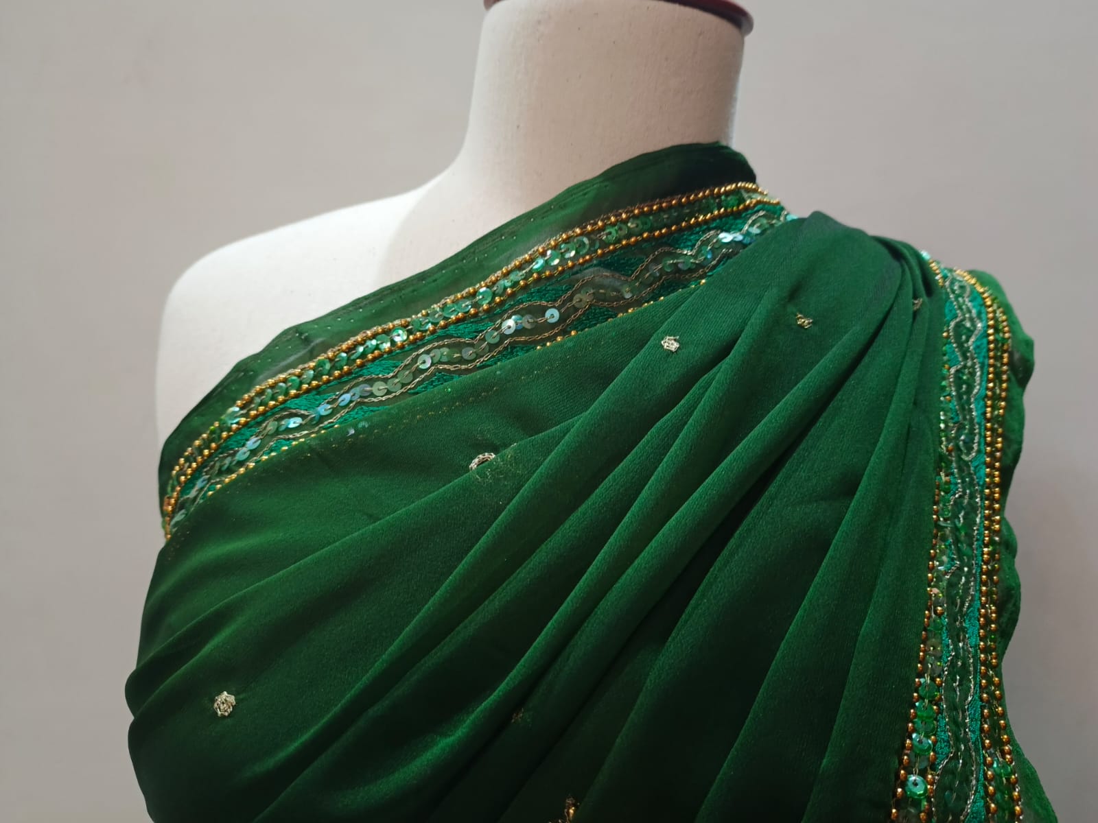 Deep Forest Green Stitched Silk Saree with Sequin and Zari Embroidery