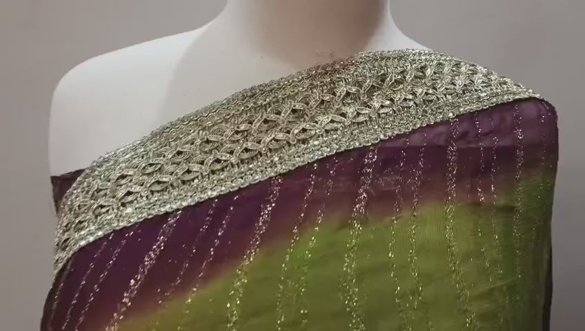 Gracefully elegant, this olive green chiffon saree features subtle vertical golden lines that add a delicate shimmer to its flowy drape. The rich maroon edges paired with an intricately embroidered gota border enhance its festive appeal. Perfect for weddings, sangeet nights, and special occasions, this saree strikes the ideal balance between traditional charm and modern grace. Pair it with statement earrings and a sleek blouse for a standout look.