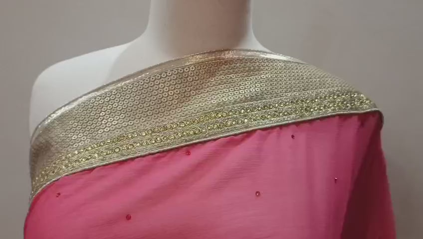 Border: Likely brocade or embellished silk, with dense sequin and zari (metallic thread) work.