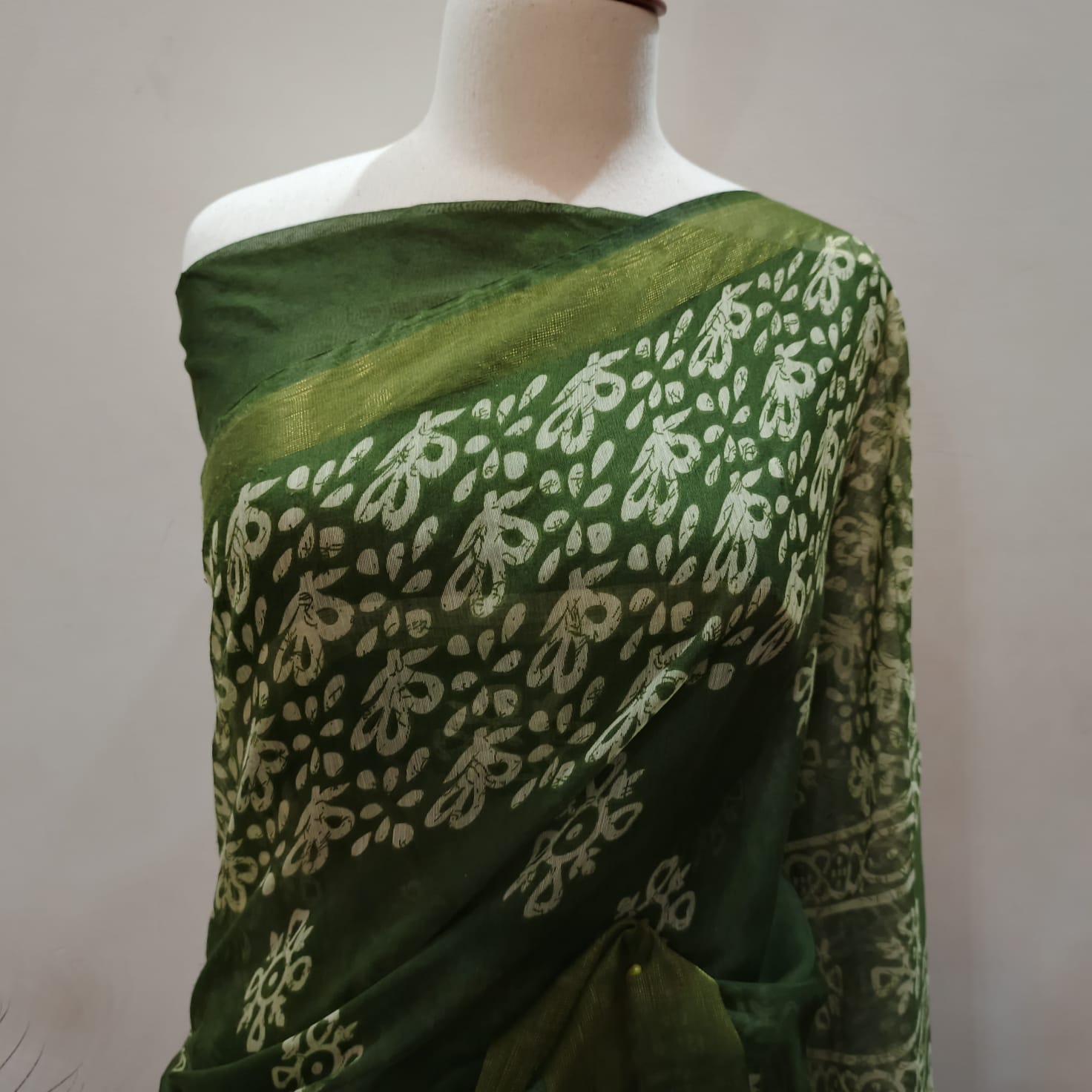 Elegant Forest Green Hand-Printed Cotton Saree with Golden Zari Border