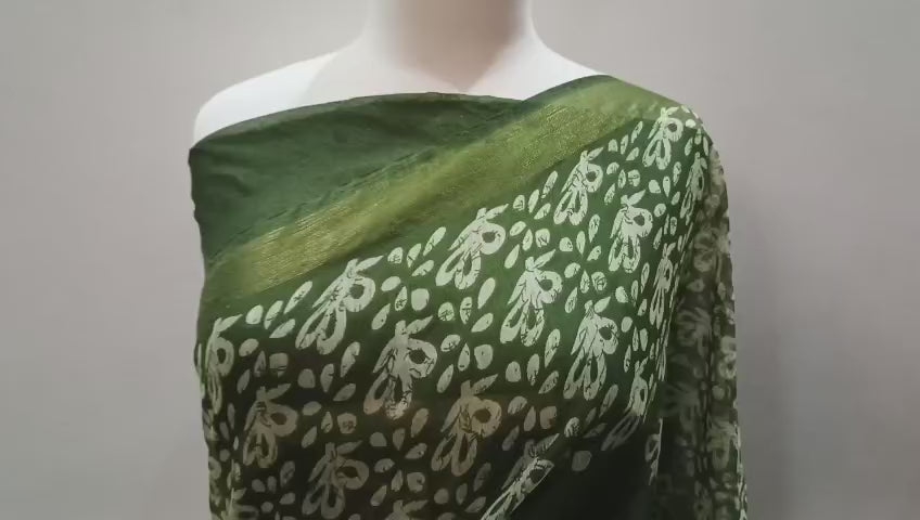 This stunning 7-yard cotton saree features a rich forest green base adorned with traditional hand-printed white floral and paisley motifs. The lightweight fabric ensures comfort while the shimmering golden zari border adds a touch of festive charm and sophistication. Perfect for casual elegance or traditional gatherings, this saree blends classic artistry with understated grace.