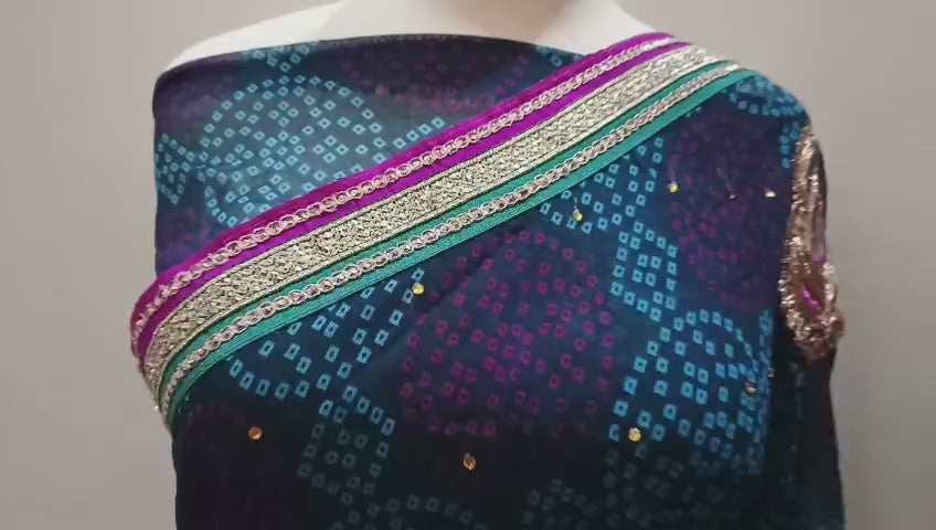 A vibrant royal blue saree featuring a traditional Chunri pattern in teal blue and magenta.