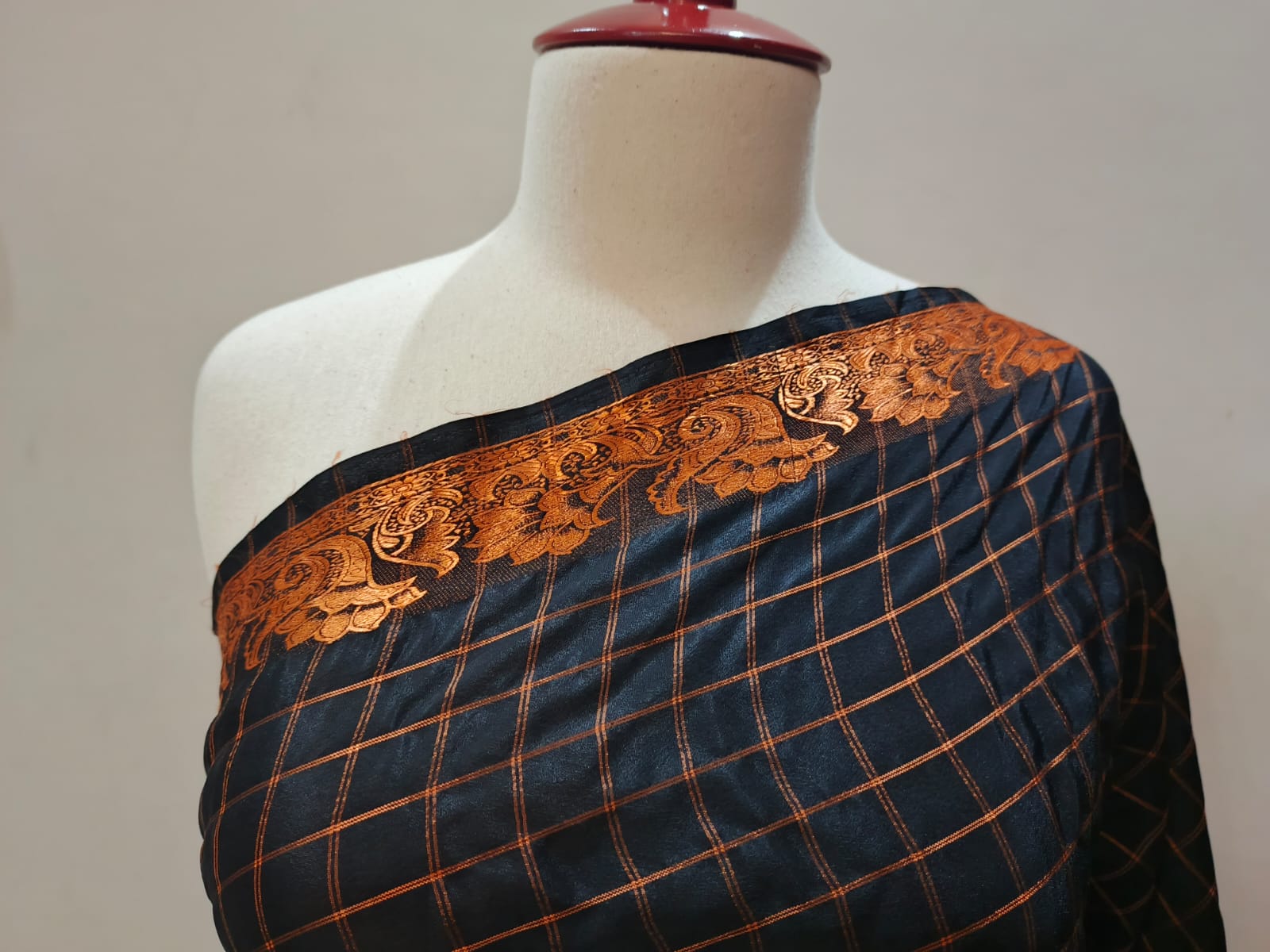 Stitched Black Silk Saree with Copper Zari Checks & Unstitched Matching Blouse Piece