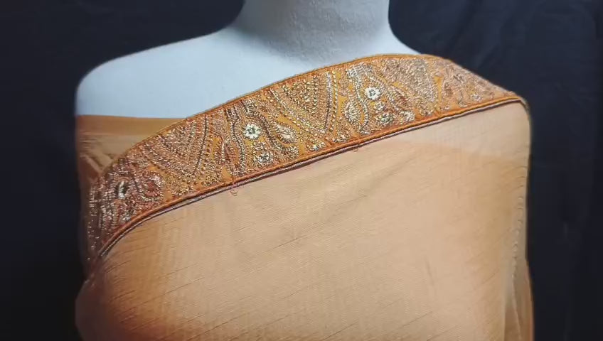Drape yourself in the captivating allure of this two-toned Chiffon saree. The fabric gracefully transitions from a sunny yellow at the top to a vibrant orange at the bottom, creating a beautiful ombre effect. Adding a touch of opulence is the delicate gold foil printed border that runs along the edges, enhancing its elegance. Crafted from lightweight Chiffon, this saree drapes beautifully and feels comfortable to wear. Perfect for festive occasions, daytime events, or adding a splash of color to your wardrobe.